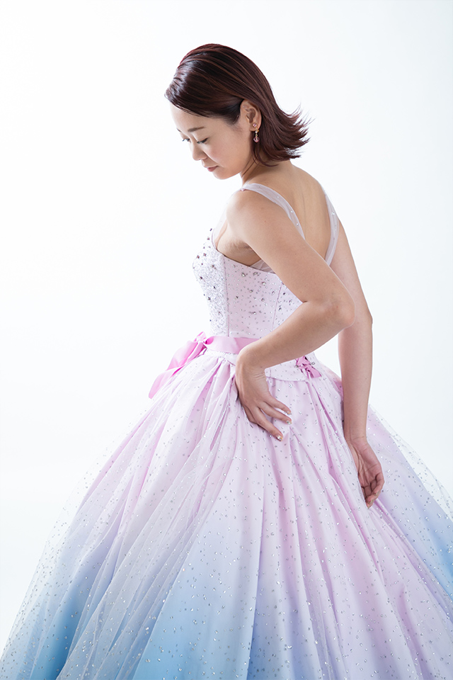 シャーベットカラーの2色のグラデーションが美しいドレス。シャボン玉みたいな色合いのラムネシャーベットのイメージです。全面に施されたグリッターは、氷のつぶのようにキラキラ輝きます。ヨークは取り外しでご着用いただけます。