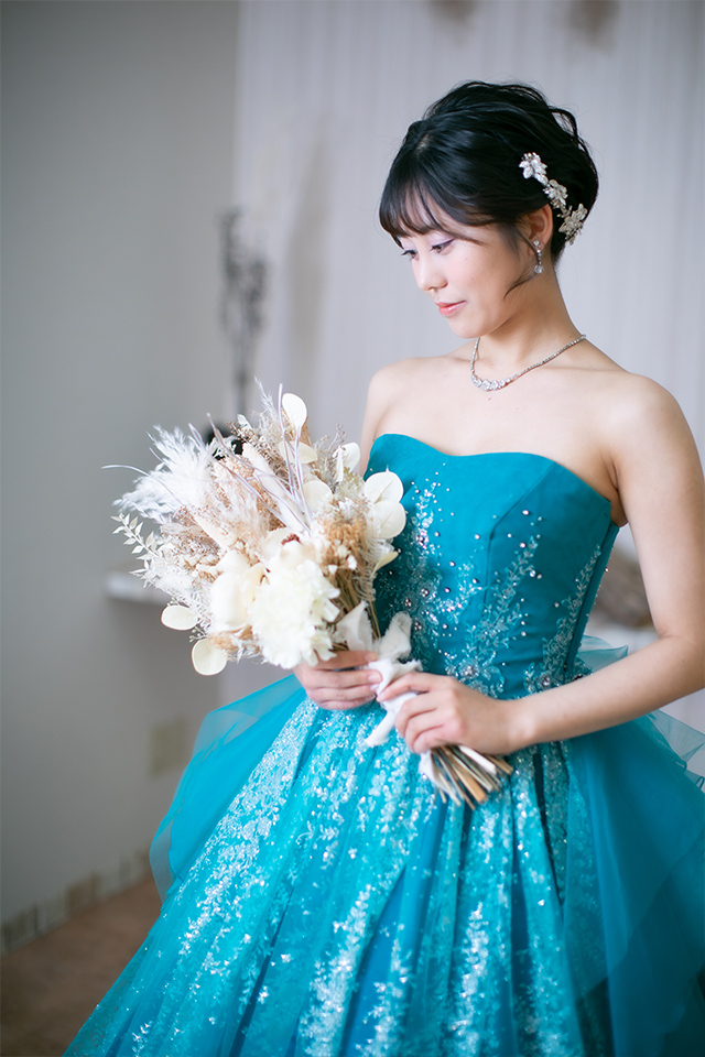 繊細なグリッターに色鮮やかなブルーグリーンが映える一着。バックスタイルにも甘すぎない後フリルがあしらわれ、大人かわいい華やかなデザイン。