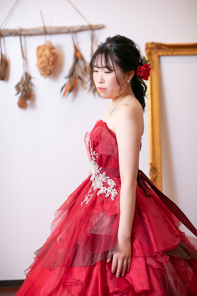 さまざまな種類のオーガンジィーフリルをミックスしてつくるボリュームのあるスカートは大輪の花びらをイメージしています。見ごろはシンプルにドレープのみでデザインし、ウエストにパールとビーズの輝きでアクセントをつけました。