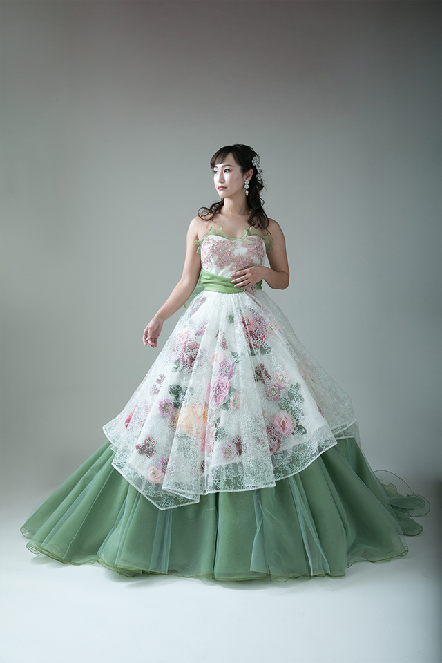 アンニュイな配色のチュールを幾重にも重ねたボリュームのあるスカートと、身頃に豪華にあしらったアンティーク調のビーディングリバーレースが圧巻の美しさ・・・シンプルなスタイルでありながらも印象的なカラードレスです。