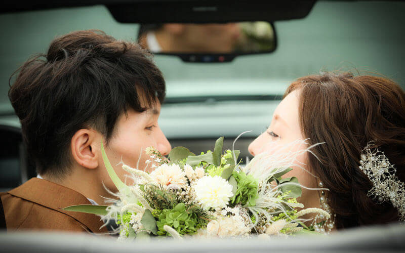 フロッキー加工で描き出されたバラ柄がブライドの個性を引き立てます。フリルをMIXしたバックリボンで華やかさをプラスしています。