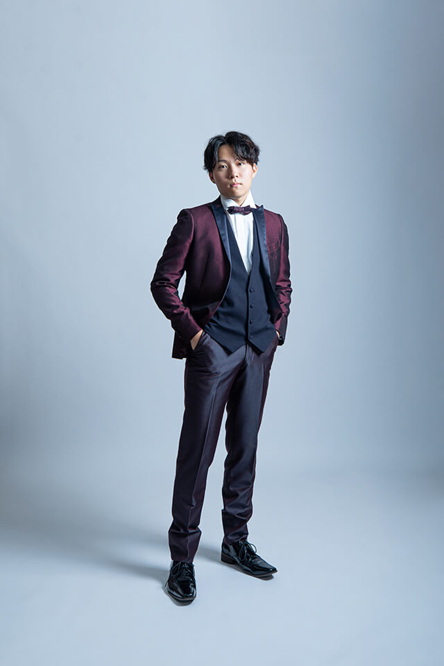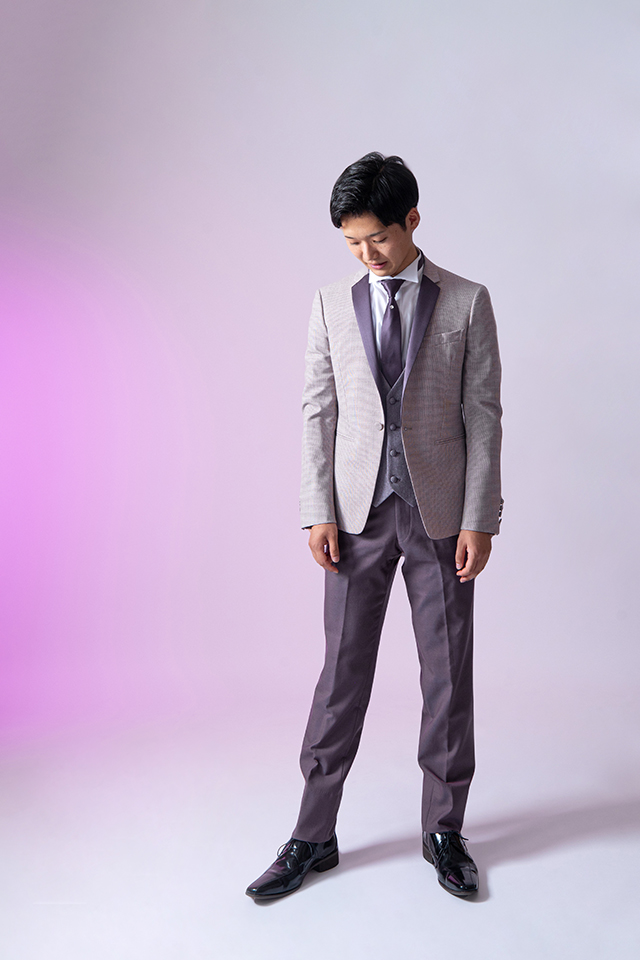 ラベンダーカラ―にシックな色目。パンツに黒を合わせより男らしい装いを演出します。タイが二本付属しており、クールに決まるダークカラーのタイとナチュラルに上品さのある蝶タイで印象を変えれるタキシードです。