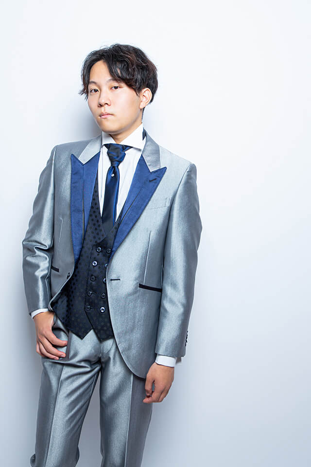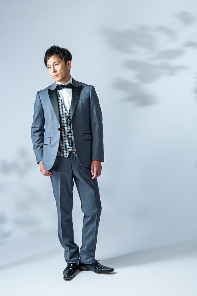 上品で三彩に輝くシルバーカラーのチュニックタキシードは、会場のライトに、また、自然光にも映える万能タキシードです。ブラックカラーのベストタイが男性らしさを際立たせ、ラペルのサテン光沢が顔周りを華やかに彩るタキシードです。