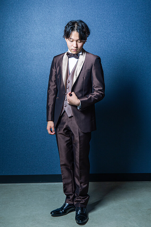 シンプルなブラウンカラーのショートタキシード。落ち着いた印象のブラウンカラーに合わせた、ライトブラウンをサテンが、柔らかく優しいコーディネートを作りだしています。上品さの中に、ドット柄のベストや、蝶ネクタイなどを合わせることにより、可愛さもプラスされた、幅広いシーンでご使用いただけるタキシードです。