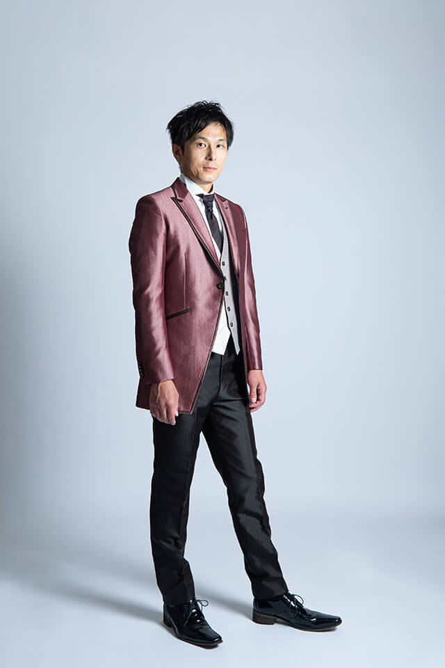フロントのカッティングがシャープなシルエットを創るコーディネートスーツです。ジャケット素材は暖色系ドレスを美しく引立てるボルドーシャドーストライプです。シャンブレーボルドーパンツとチャコールグレーベストでオシャレなコーディネートです。